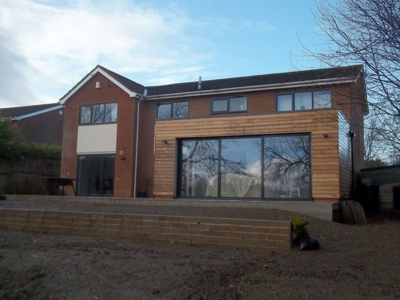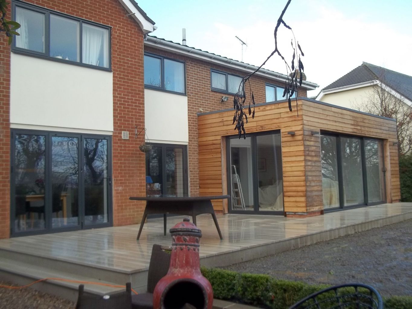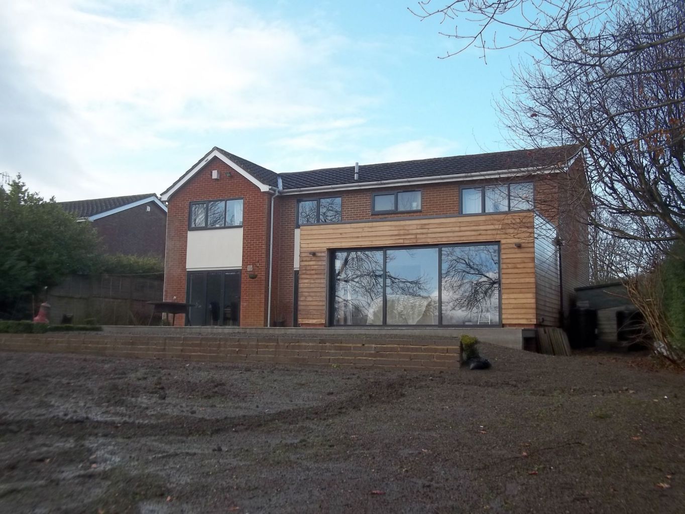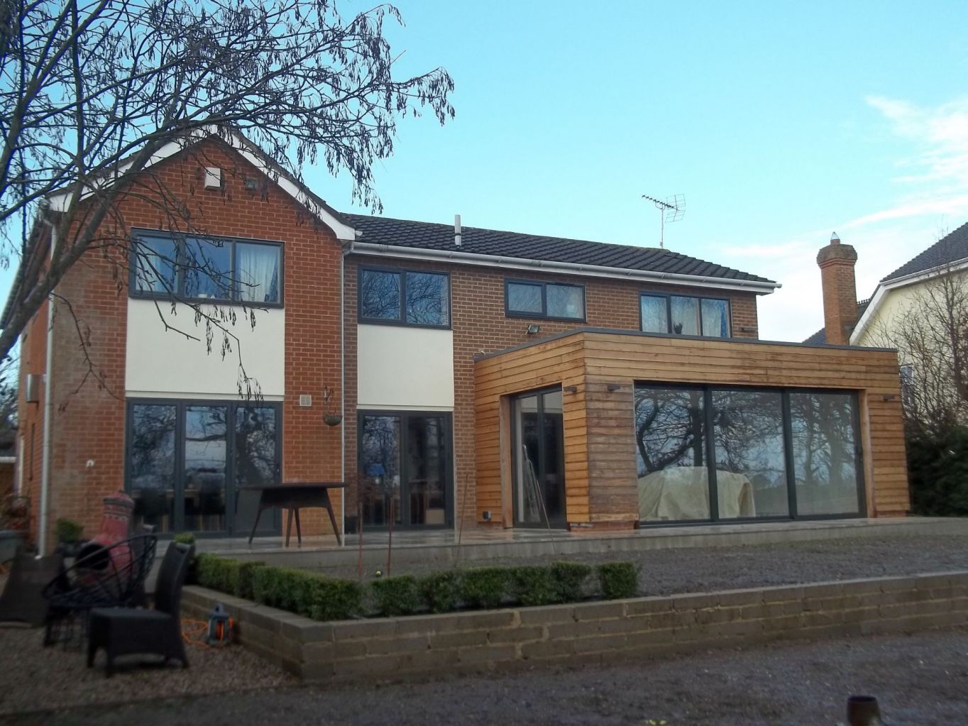 We built to the rear of this property, constructing a new sunroom extension, a front double storey extension with a porch and a bedroom above while making most of the ground floor open plan.