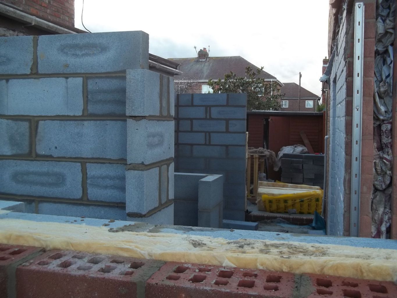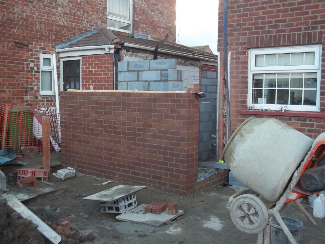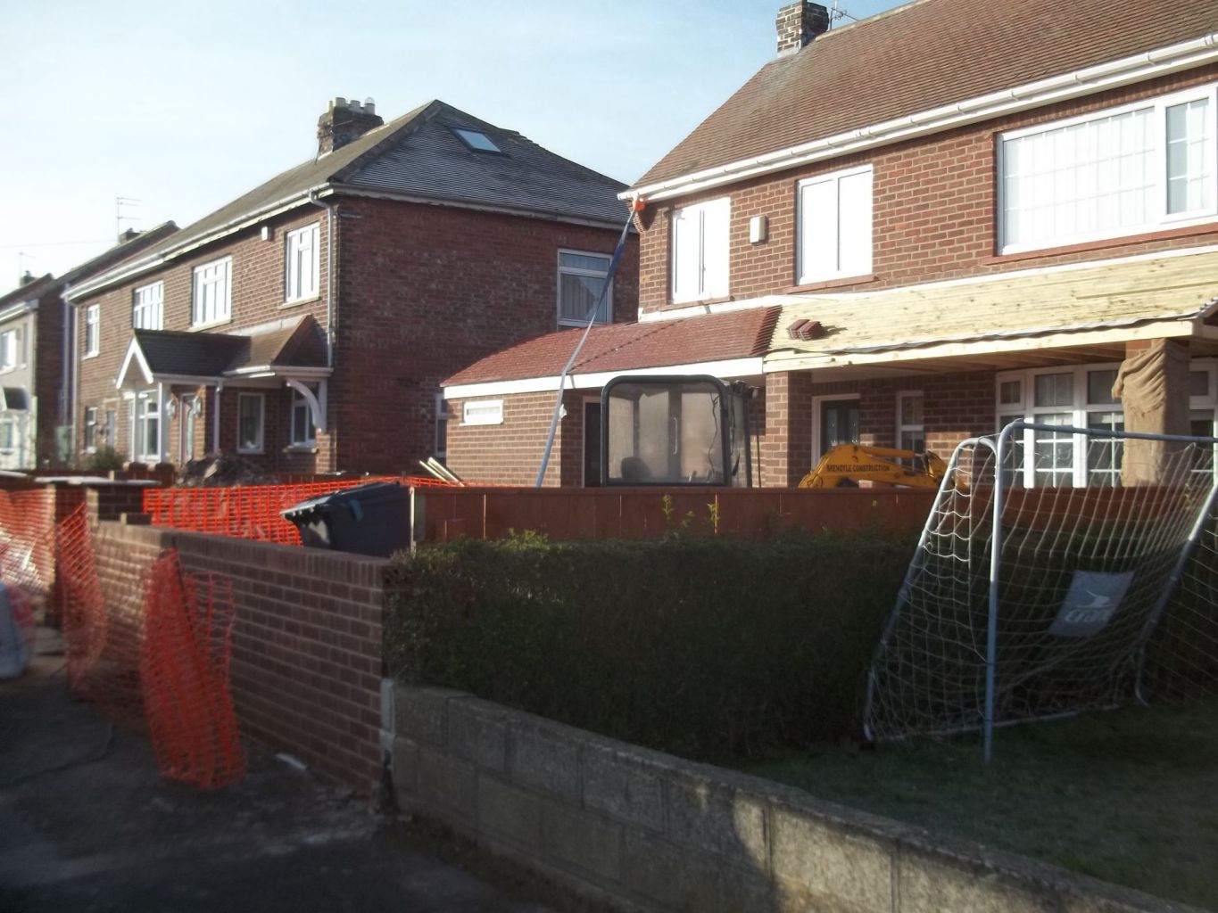 We constructed a single story kitchen dining room, open plan extension to the side, a WC room and a utility storage room to the front with a full lean-to roof with brick piers.